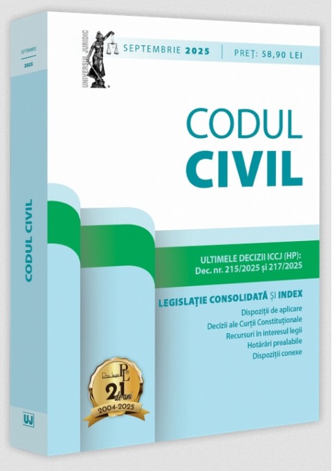 CODUL CIVIL: SEPTEMBRIE 2025 LEGISLATIE CONSOLIDATA SI INDEX ULTIMELE DECIZII ICCJ (HP): Dec. nr. 215/2025 si 217/2025 Editia a 25-a (revizuita) a lucrarii, Codul civil: septembrie 2025, ingrijita de prof. univ. dr. Dan Lupascu si tiparita pe hartie alba de calitate superioara, contine textul Codului civil actualizat, imbogatit cu dispozitii de aplicare, decizii ale Curtii Constitutionale, recursuri in interesul legii, DECIZII ICCJ (HP) – inclusiv Dec. nr. 215/2025 si 217/2025, NUMEROASE DISPOZITII CONEXE si referinte legislative deosebit de utile. Indexul plasat la finalul Codului faciliteaza utilizarea acestuia, indicand sediul materiei pentru diverse institutii de drept importante in domeniul civil si asigurand o cautare rapida a sintagmelor-cheie aferente. Lucrarea Codul civil: septembrie 2025 este destinata judecatorilor, procurorilor, avocatilor, consilierilor juridici, notarilor, executorilor judecatoresti, arbitrilor, mediatorilor, expertilor judiciari (practicienilor, in general), dar si teoreticienilor si studentilor (intregului mediu universitar) si chiar publicului larg. PRO LEGE – O colectie necesara oricarui jurist: ● reuneste intre copertele fiecarei culegeri informatii esentiale si extinse din domeniul abordat, inlesnind astfel utilizatorului activitatea de cercetare, reducand semnificativ si eficient timpul dedicat acesteia; ● prezinta pachete de acte normative consolidate, atent selectate in vederea acoperirii domeniului vizat, imbogatite cu note si referinte utile, structurate si evidentiate profesionist si menite a facilita intelegerea vointei si a intentiilor legiuitorului (prin semnalarea si/sau prin prezentarea unor corelatii ori a unor spete relevante, in unele cazuri prin oferirea unor lamuriri punctuale etc.); ● este tiparita pe hartie alba de calitate superioara, ideala pentru adnotarile necesare in activitatea didactica si practica; ● seria PREMIUM din cadrul colectiei PRO LEGE include un vast material informativ suplimentar (dupa caz, jurisprudenta europeana, mai multa jurisprudenta nationala si mai multe legi conexe integrale sau in extras, varii adnotari etc.); ● fiecare culegere in parte constituie, practic, un instrument juridic complex, indispensabil activitatii de zi cu zi in cadrul domeniului caruia ii este dedicata si pe care il reprezinta, organizand unitar informatiile necesare unei bune cunoasteri a domeniului respectiv. COORDONAREA GENERALA a Colectiei PRO LEGE este asigurata de consilier juridic Oliviu Craznic. Asteptam sugestiile si propunerile dvs pe adresa prolege [at] universuljuridic.ro