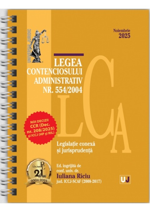Lucrarea Legea contenciosului administrativ nr. 554/2004, legislatie conexa si jurisprudenta Noiembrie 2025 (editie spiralata), tiparita pe hartie alba (de calitate superioara) si ingrijita de conf. univ. dr. Iuliana Riciu (judecator ICCJ-SCAF 2008-2017), cuprinde: Legea contenciosului administrativ nr. 554/2004; O.U.G. nr. 27/2003 privind procedura aprobarii tacite; O.G. nr. 27/2002 privind reglementarea activitatii de solutionare a petitiilor; Legea nr. 544/2001 privind liberul acces la informatiile de interes public; Normele metodologice de aplicare a Legii nr. 544/2001 (H.G. nr. 123/2002); O.G. nr. 2/2001 privind regimul juridic al contraventiilor; un index concis, dar relevant.