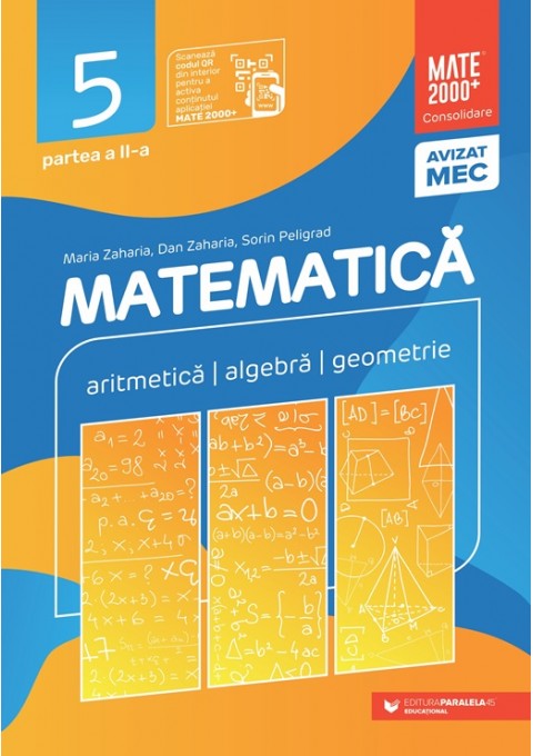 Seria de lucrari: MATE 2000+ CONSOLIDARE, destinata claselor de gimnaziu, respecta toate cerintele programei referitoare la competente generale, competente specifice si continuturi, oferind sugestii metodologice dintre cele mai atractive. Pentru a veni in sprijinul elevului, al profesorului si al parintilor, domeniile de continut prevazute de programa sunt organizate pe unitati de invatare, fiecare avand un anumit numar de lectii. Fiecare unitate de invatare este finalizata cu Recapitulare si sistematizare prin teste, prin care se aprofundeaza, se perfectioneaza si se dezvolta cunostintele si competentele elevului. Urmeaza procesul de masurare si apreciere a valorii rezultatelor invatarii printr-un Test de autoevaluare, prevazut cu punctaj, ca element esential si definitoriu al procesului de invatare, situat pe acelasi plan cu insusirea cunostintelor, cu formarea si dezvoltarea competentelor. Fiecare lectie contine: un text teoretic succint, obligatoriu (rezumat al continuturilor invatarii propuse de programa), care cuprinde notiuni si relatii (introduse prin definitii si notatii corespunzatoare), proprietati (teoreme, propozitii etc.), metode (reguli de calcul, algoritmi de lucru etc.). Pentru a fi bine intelese si retinute de elevi, notiunile teoretice sunt insotite de exemple si modele de rezolvari; activitati de consolidare a invatarii, pentru lucrul la clasa si pentru acasa (afterschool, homeschooling), care grupeaza tipuri diverse de exercitii si probleme pe patru niveluri progresive: 1) intelegere; 2) aplicare si exersare; 3) aprofundare si performanta; 4) supermate (nivel destinat elevilor si profesorilor preocupati de pregatirea in vederea obtinerii unor rezultate deosebite la concursuri si olimpiade scolare). Aceasta abordare modulara permite aplicarea metodei interactive moderne de invatare centrata pe elev stiu / vreau sa stiu / am invatat. Recapitularea continuturilor si competentelor prevazute de programa scolara, incluse in capitolele Fractii zecimale si Elemente de geometrie si unitati de masura, este realizata prin Teste recapitulative, prevazute cu punctaj pentru o evaluare cat mai obiectiva, elaborate conform standardelor Ministerului Educatiei, fiecare cu itemi din domeniile de continut din programa. Recapitularea finala a tuturor continuturilor si competentelor prevazute de programa scolara pentru clasa a V-a este un element de originalitate prin temele de recapitulare propuse si capata o noua dimensiune prin completarea acestora cu teste de evaluare finala.