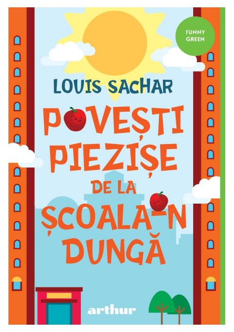 In loc sa aiba un etaj si treizeci de clase una dupa alta, are treizeci de etaje cu cate o clasa pe fiecare nivel. Constructorul a spus ca-i pare rau. Copiilor de la Scoala-n Dunga le place sa aiba o scoala piezisa. Au un teren de joaca neinchipuit de mare...