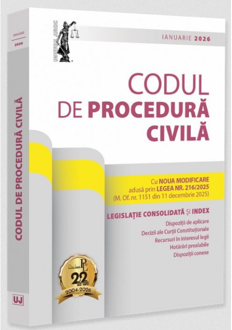 CODUL DE PROCEDURA CIVILA: IANUARIE 2026 LEGISLATIE CONSOLIDATA SI INDEX   Cu NOUA MODIFICARE adusa prin LEGEA NR. 216/2025 (M. Of. nr. 1151 din 11 decembrie 2025)   Editia a 25-a (revizuita) a lucrarii, Codul de procedura civila: ianuarie 2026, tiparita pe hartie alba de calitate superioara si ingrijita de prof. univ. dr. Dan Lupascu, contine textul Codului de procedura civila actualizat (cu NOUA MODIFICARE adusa prin LEGEA NR. 216/2025 – M. Of. nr. 1151 din 11 decembrie 2025), imbogatit cu dispozitii de aplicare, decizii ale Curtii Constitutionale, recursuri in interesul legii, hotarari prealabile, TAXE JUDICIARE DE TIMBRU (extrase din O.U.G. nr. 80/2013 – ACTUALIZATA), NUMEROASE DISPOZITII CONEXE si referinte legislative deosebit de utile. Indexul plasat la finalul Codului faciliteaza utilizarea acestuia, indicand sediul materiei pentru diverse institutii de drept importante in domeniul procedurii civile si asigurand o cautare rapida a sintagmelor-cheie aferente. Editia cuprinde si: Legea nr. 172/2022 pentru ratificarea Protocolului nr. 16 la Conventia pentru apararea drepturilor omului si a libertatilor fundamentale; Legea nr. 173/2022 pentru adoptarea unor masuri necesare punerii in aplicare a Protocolului nr. 16 (extras). Lucrarea Codul de procedura civila: ianuarie 2026 este destinata judecatorilor, procurorilor, avocatilor, consilierilor juridici, notarilor, executorilor judecatoresti, arbitrilor, mediatorilor, expertilor judiciari (practicienilor, in general), dar si teoreticienilor si studentilor (intregului mediu universitar).   PRO LEGE – O colectie necesara oricarui jurist:  ● reuneste intre copertele fiecarei culegeri informatii esentiale si extinse din domeniul abordat, inlesnind astfel utilizatorului activitatea de cercetare, reducand semnificativ si eficient timpul dedicat acesteia; ● prezinta pachete de acte normative consolidate, atent selectate in vederea acoperirii domeniului vizat, imbogatite cu note si referinte utile, structurate si evidentiate profesionist si menite a facilita intelegerea vointei si a intentiilor legiuitorului (prin semnalarea si/sau prin prezentarea unor corelatii ori a unor spete relevante, in unele cazuri prin oferirea unor lamuriri punctuale etc.); ● este tiparita pe hartie alba de calitate superioara, ideala pentru adnotarile necesare in activitatea didactica si practica; ● seria PREMIUM din cadrul colectiei PRO LEGE include un vast material informativ suplimentar (dupa caz, jurisprudenta europeana, mai multa jurisprudenta nationala si mai multe legi conexe integrale sau in extras, varii adnotari etc.); ● fiecare culegere in parte constituie, practic, un instrument juridic complex, indispensabil activitatii de zi cu zi in cadrul domeniului caruia ii este dedicata si pe care il reprezinta, organizand unitar informatiile necesare unei bune cunoasteri a domeniului respectiv. COORDONAREA GENERALA a Colectiei PRO LEGE este asigurata de consilier juridic Oliviu Craznic.  Asteptam sugestiile si propunerile dvs pe adresa prolege [at] universuljuridic.ro