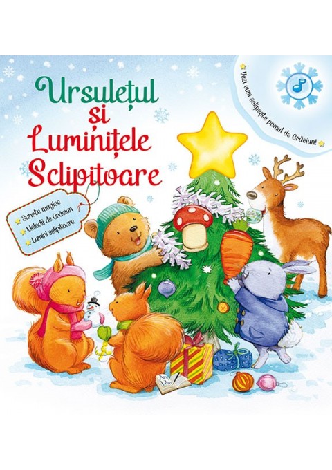 Ursuletul si prietenii lui sarbatoresc Craciunul! Alatura-te distractiei din poiana, aprinzand felinarele atarnate in brad, ascultand o melodie festiva si umplandu-ti sarbatoarea cu magie! Apasa butonul ca sa aprinzi toate felinarele si vei auzi o melodie. O minunata carte cu sunete si luminite!